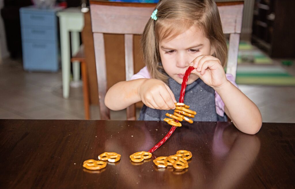 Any snack with a hole in it will work for this one, we just happened to have a lot of pretzels on hand (we do live in Germany afterall 😉 ).