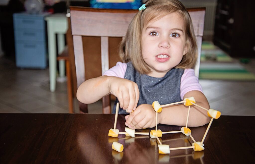 I’m sure we all remember building molecules with grapes, marshmallows, etc. in high school, it seems like a classic chemistry teacher craft! I had string cheese on hand so I cubed it and added a few toothpicks for my very hungry scientist!