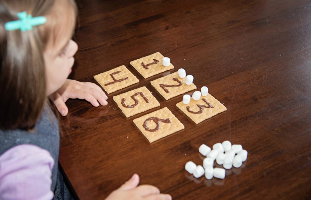 Delicious and educational, can’t beat that combo! I melted a few chocolate chips to paint the numbers on the graham crackers, let it dry and you’re set with an easy treat!