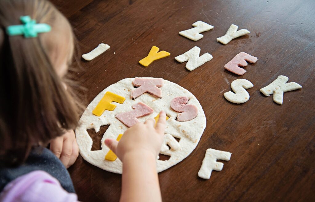 I used letter shaped cookie cutters to punch out the tortilla, cheese, and ham, it worked pretty well and made for a filling academic experience.
