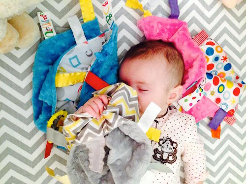 Babies develop cognitively, socially and emotionally through sensory play. Our satin modern top fabric paired with dimple dot minky backing gives a soothing experience for little ones. Accented along the edges are a variety of colored and textured ribbon tabs, sewn shut for added safety. A link loop with attached toy link is provided on every product to clip to a baby sling/carrier or stroller. For more information, visit www.babyjackblankets.com.